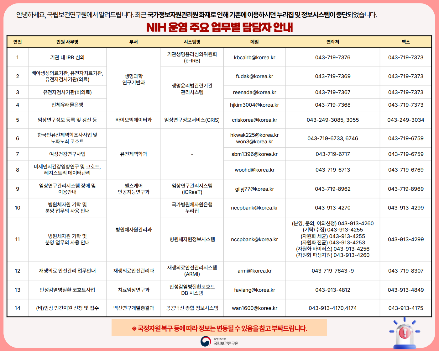 질병관리청(청장 임승관)은 9월 26일 발생한 국가정보자원관리원 화재로 질병관리청 및 소속기관 홈페이지,